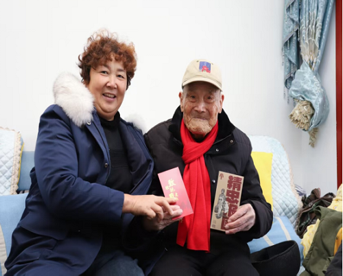 1月14日至15日,支部走访了98岁河南籍抗战老兵王方爷爷和高爷爷的遗孀师婆婆,黄埔军校17期骑兵师103岁陈焜生爷爷、100岁杨炳玉爷爷和倪爷爷遗孀肖婆婆,分别给他们带去了保暖棉背心、帽子、挂历、枸杞等物资,以及一套从美国国家档案馆影印的日本投降诏书和一封慰问书,同时还送去了1000元的慰问金。